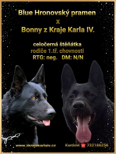 Otec tohoto vrhu Blue Hronovský pramen je velký, nádherný pes s velmi silnou kostrou a krásnou hlavou. Má téměř černé oko. Je úžasný v povaze, naprosto vyrovnaný a neřeší prostředí ani povrchy ... Matka vrhu je celočerná fena Bonny z Kraje Karla IV. Bonča má krásnou velkou hlavu a silnou kostru. Vede velmi zajímavý pracovní rodokmen. Je temperamentní a vyrovnané povahy. U tohoto vrhu je předpoklad velmi pěkného exteriéru a vyrovnané povahy. Po rodičích celý vrh bude ( degenerativní myelopatie ) DM N/N free !!! Tento vrh je pro nás návrat ke kořenům, kdy v roce 2003 jsme na této krvi svůj chov postavili. Na tento vrh se opravdu velmi těšíme :-)