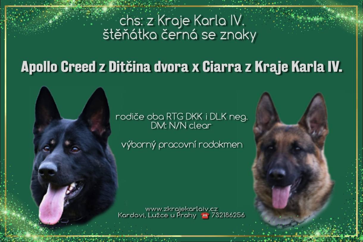 Otec tohoto vrhu Apollo Creed z Ditčina dvora je velmi mladý, talentovaný pes, který má ještě vše před sebou. Naprosto pohodový, vyrovnaný pes, který nemá žádný problém s prostředím, lidmi a psy ... Na jeho odchov se moc těšíme !!! Od tohoto spojení očekáváme šikovná štěňátka s širokým spektrem uplatnění. Vhodná budou především pro chov, sport i do aktivní rodiny. Chovatelský servis je u nás samozřejmost. Nezávazná návštěva je po domluvě vítána. Rádi se vším poradíme.